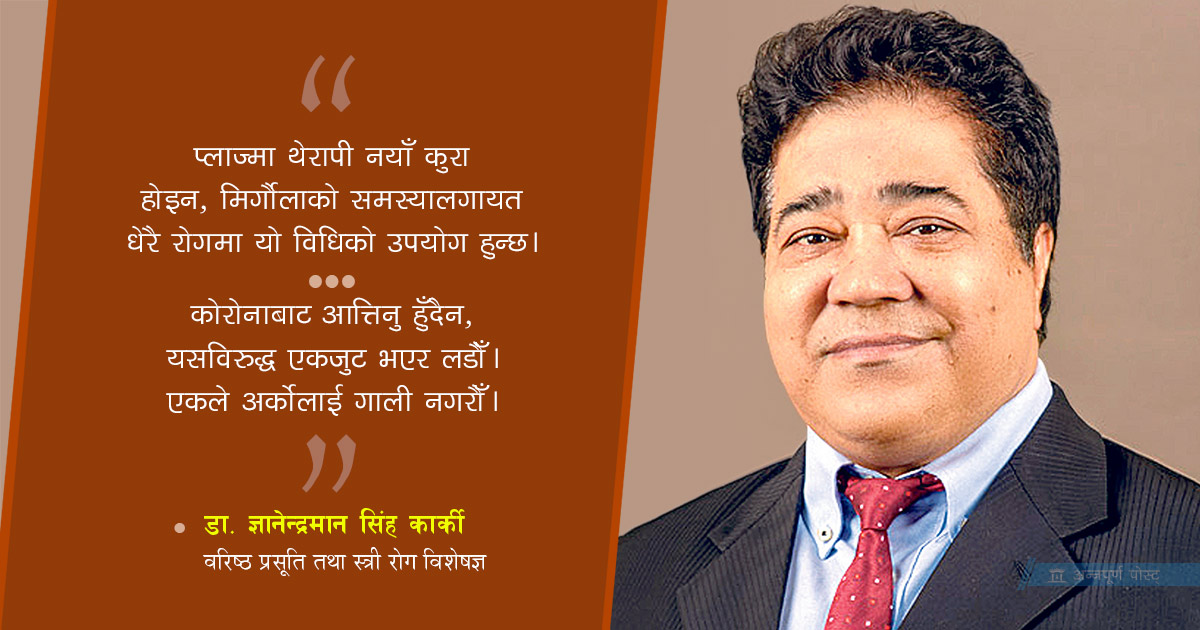 वरिष्ठ प्रसूति तथा स्त्री रोग विशेषज्ञ डा. ज्ञानेन्द्रमान सिंह कार्की हालै कोरोना संक्रमित भए। कन्भालेसेन्ट प्लाज्मा थेरापी विधिबाट उपचारपछि उनी त्रिवि शिक्षण अस्पताल महाराजगन्जको शय्यामा आराम गरिरहेका छन्। मोरङ विराटनगरस्थित विराट मेडिकल कलेजका अध्यक्ष डा। कार्कीसँग अस्पतालमै अन्नपूर्णकर्मी दिनेश गौतमले गरेको संवाद