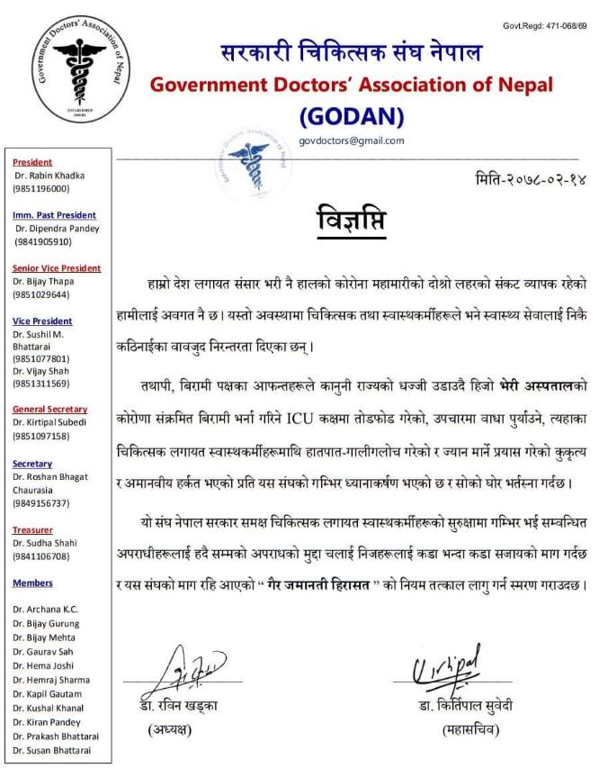काठमाडौं । सरकारी चिकित्सक संघ (गोदान)ले भेरी अस्पतालमा कार्यरत स्वास्थ्यकर्मीमाथि विहिबार साँझ भएको दुव्यर्वहारप्रति गम्भीर ध्यानाकषर्ण भएको जनाउँदै भत्र्सना गरेको छ ।