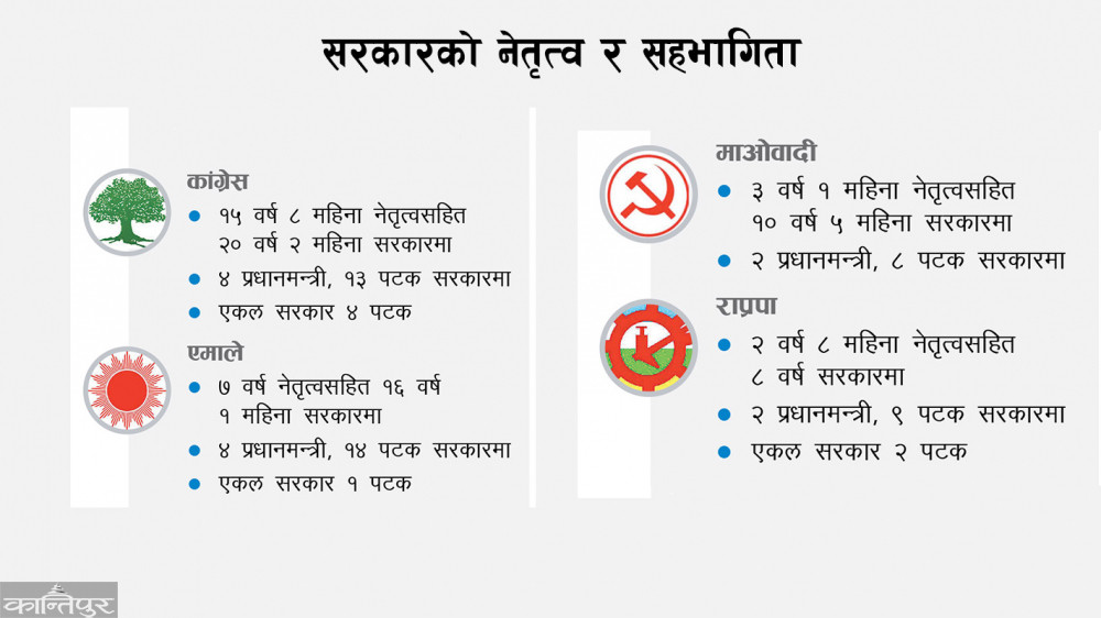 यो बीचमा कांग्रेस १५ वर्ष ८ महिना नेतृत्वसहित २० वर्ष सरकारमा बसेको छ । मूलधारमा आएको १५ वर्ष मात्र भए पनि माओवादी १० वर्ष ५ महिना सरकारमा बसेको छ ।