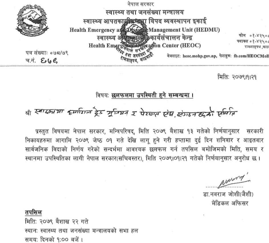 स्वास्थ्य तथा जनसंख्या मन्त्रालयले एक सूचना जारी गर्दै ठूला अस्पतालका निर्देशक, स्वास्थ्यमा क्रियाशील ट्रेड यूनियन र पेशागत संघ,संगठनको समितिलाई पत्राचार गर्दे छलफलका लागि डाकेको छ ।