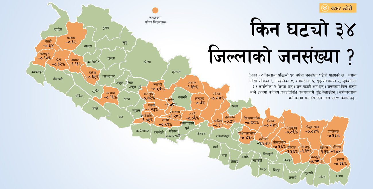 देशका ३४ जिल्लामा पछिल्लो १० वर्षमा जनसंख्या घटेको पाइएको छ। नेपालको जनसंख्या २६ लाख ७० हजार बढेर २ करोड ९१ लाख ६४ हजार ५ सय ७८ पुगे पनि यी ठाउँमा वृद्धिदर ऋणात्मक देखिएको हो। जसमा कोसी प्रदेशका ९, गण्डकीका ८, बागमतीका ६, सुदूरपश्चिमका ५, लुम्बिनीका ३ र कर्णालीका २ जिल्ला छन्। जुन पहाडी क्षेत्र हुन्।