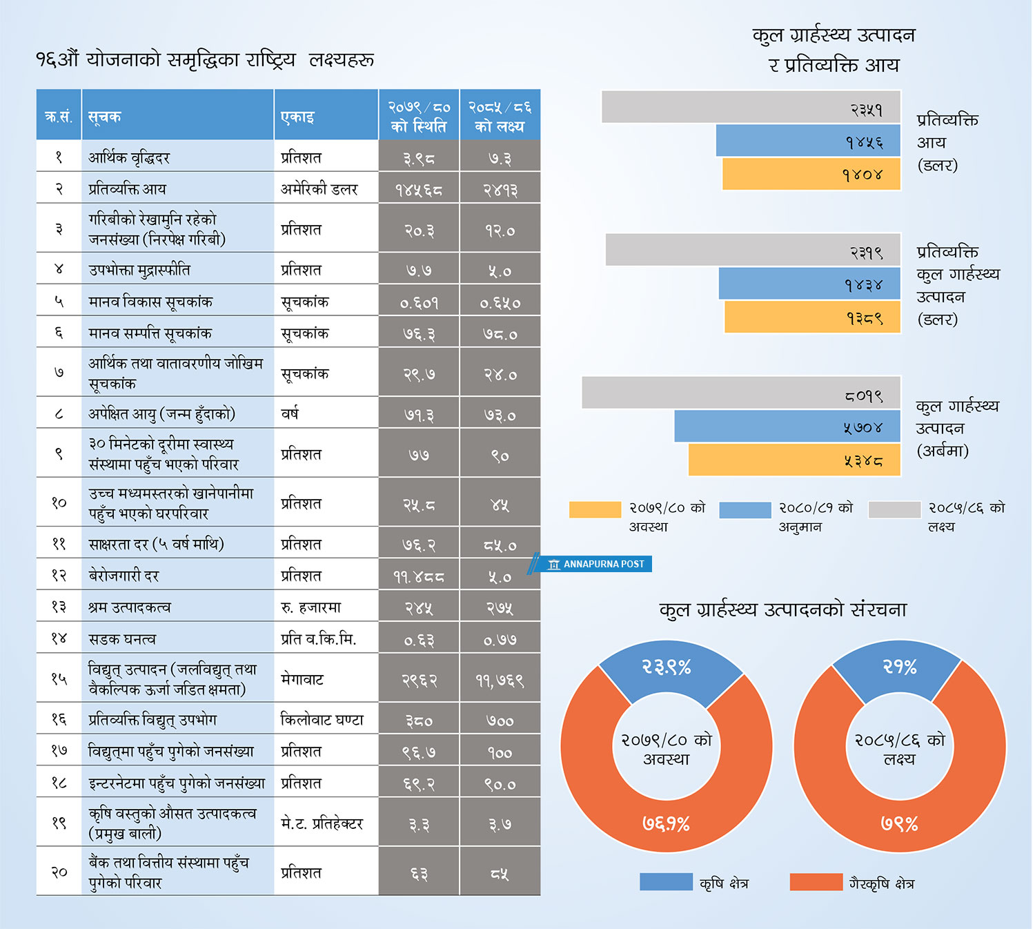 १६औं योजनामा लगानीको आकार बढाउनेदेखि कुल गार्हस्थ्य उत्पादन (जीडीपी) र प्रतिव्यक्ति आयको आकारलाई बढोत्तरी गर्ने लक्ष्य छ । समृद्धिका मुख्य २० राष्ट्रिय लक्ष्यहरूमा बेरोजगारी घटाएर प्रतिव्यक्ति आयको आकार बढाउने र गरिबीलाई कम गर्ने जस्ता उल्लेख्य सुधारको लक्ष्य हासिलमा जोड दिइएको छ । त्यसअन्तर्गत ५ वर्षको अन्त्यसमममा आर्थिक वृद्धिदर ७.३ प्रतिशत पुर्याउने लक्ष्य छ । साथै यस अवधिभर आर्थिक वृद्धि ७.१ प्रतिशतमा कायम राख्ने लक्ष्य छ । यस्तै हाल भएको प्रतिव्यक्ति आय १ हजार ४ सय ५६ अमेरिकी डलरलाई बढाएर २ हजार ३ सय ५१ पुर्याउने लक्ष्य छ ।
