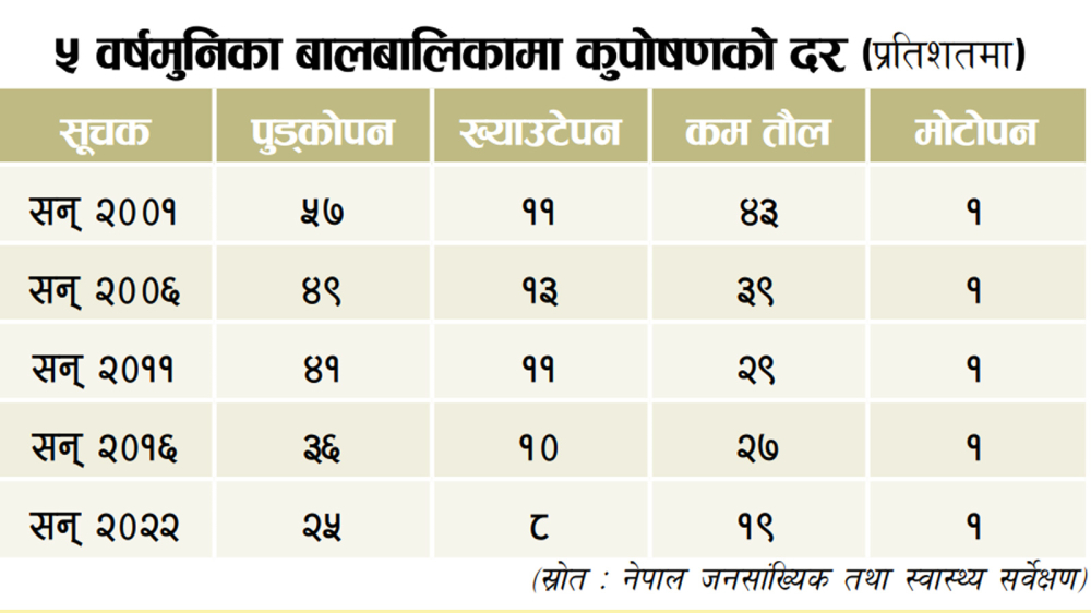 सर्वेक्षणअनुसार नेपालमा ५ वर्षमुनिका १९ प्रतिशत बालबालिकाहरू उमेरअनुसार कम तौलका छन् । १५–१९ वर्ष उमेर समूहका किशोरीमध्ये २६ प्रतिशत उमेरअनुसार दुब्ला छन् ।साभार : कान्तिपुर